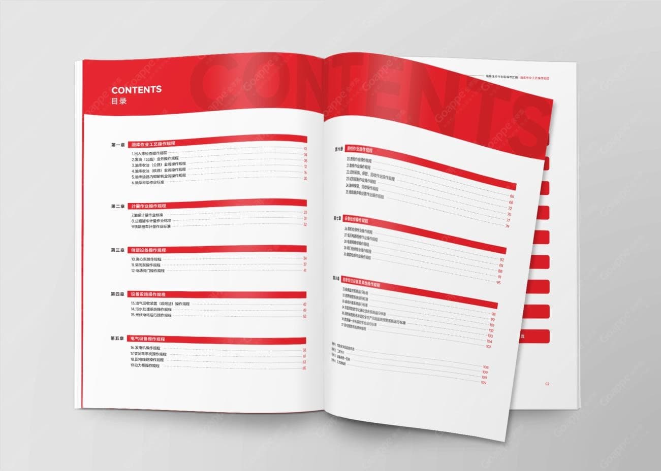 做好油库的安全生产管理,并非是一句空头口号,而是有着实质的规范制度,中国石化《油库作业指导书汇编》,即旨在将管理制度更加清晰、系统的呈现出来。从设计师所考虑的视觉角度出发,为将指导书内容清晰明确的呈现出来,整体版面选择“简而不凡”的设计手法,避免繁琐的装饰素材堆积,并在色彩组合上,大面积用色只选用中国石化的标准色“红色”及“白色”,以极简的视觉效果,进一步明确油库安全管理规章制度内容,由此发挥指导书的真正作用。