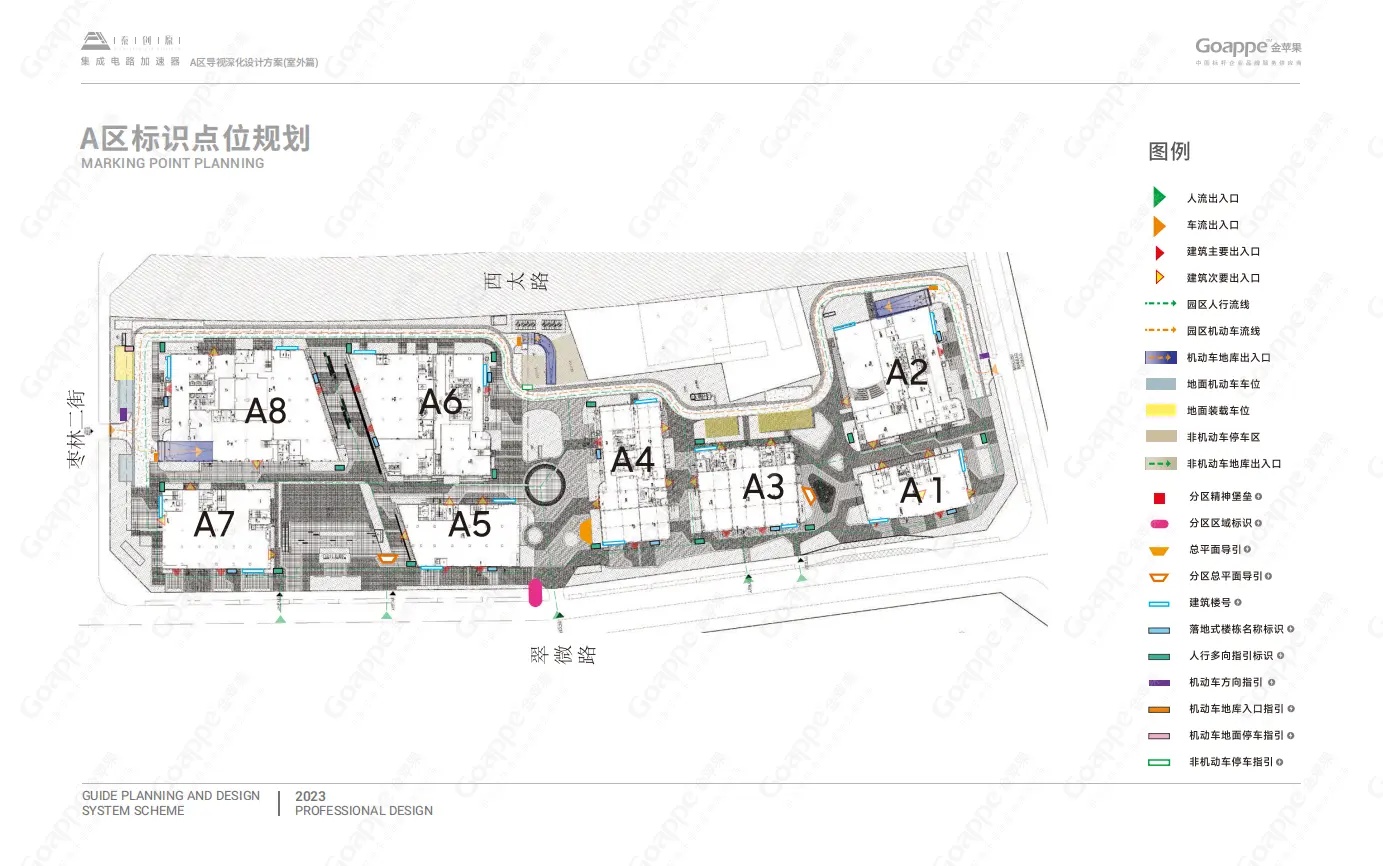 西安电子谷A区园区面积大、楼栋多、空间层次复杂,因此对导视系统的点位规划及设计提出了严峻考验。
