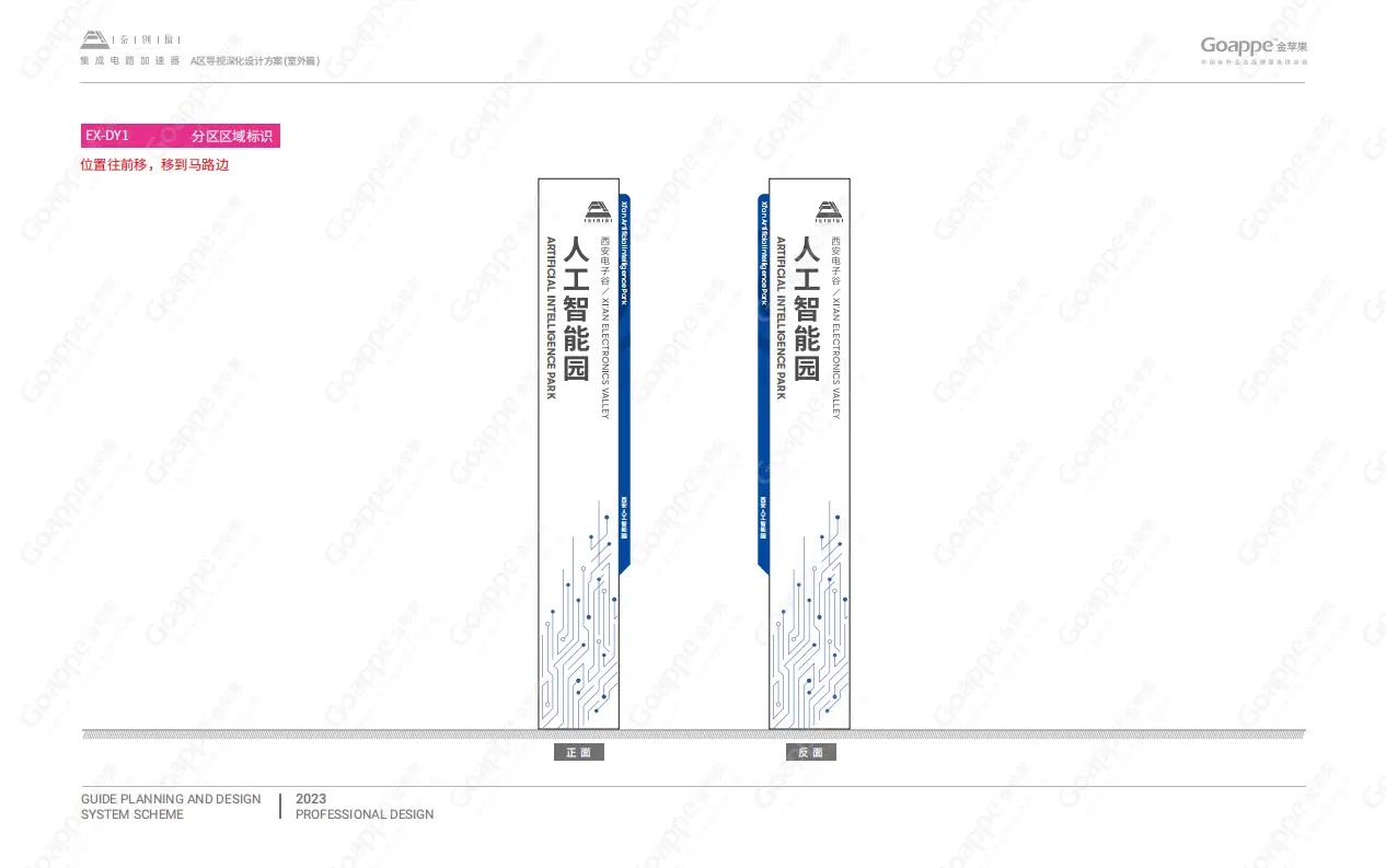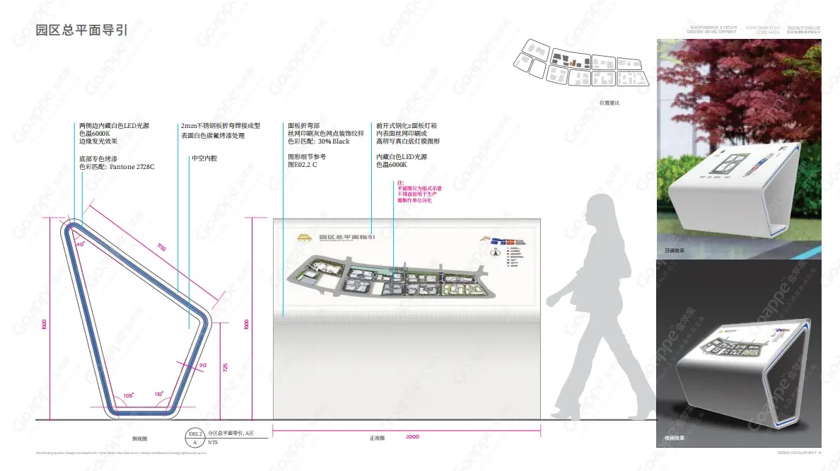 Goappe作为资深的标识导视服务企业,深知不同环境空间的导视系统除了提供方向指引、标识、地图等基本功能,还对提升空间整体形象和用户整体体验有着重要作用。因此在西安电子谷A区导视系统设计方案深化前,Goappe团队多次前往电子谷,对园区每个点位及后期导视装置安装的方位进行了实地踩点预设,以确保后期工作的高度准确性与匹配性。