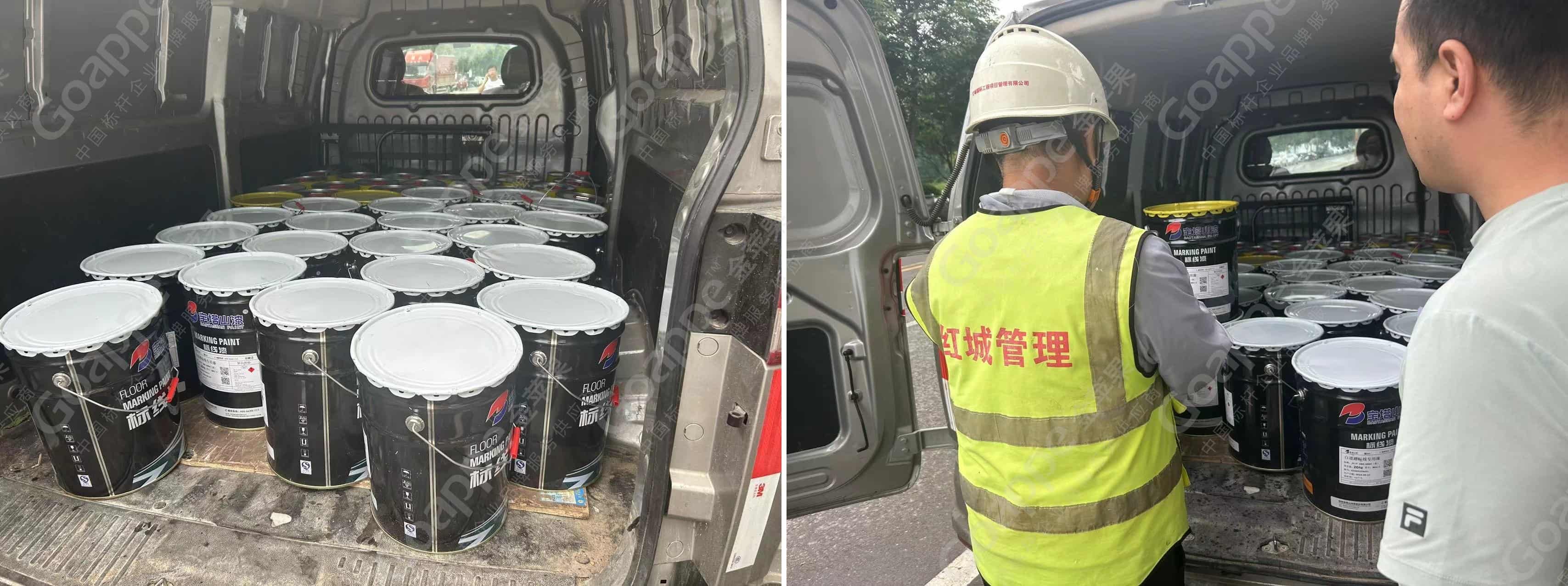 项目工程在正式大范围施工前,对划线材料的选择和小范围打样实验是必要的步骤。本项目在应用材料的选择上,团队综合考量“耐久性”、“美观性”、“环保性”、“经济性”四大原则,实地走访多个供应商原厂进行参数及效果对比,最终选择得以确认用料。