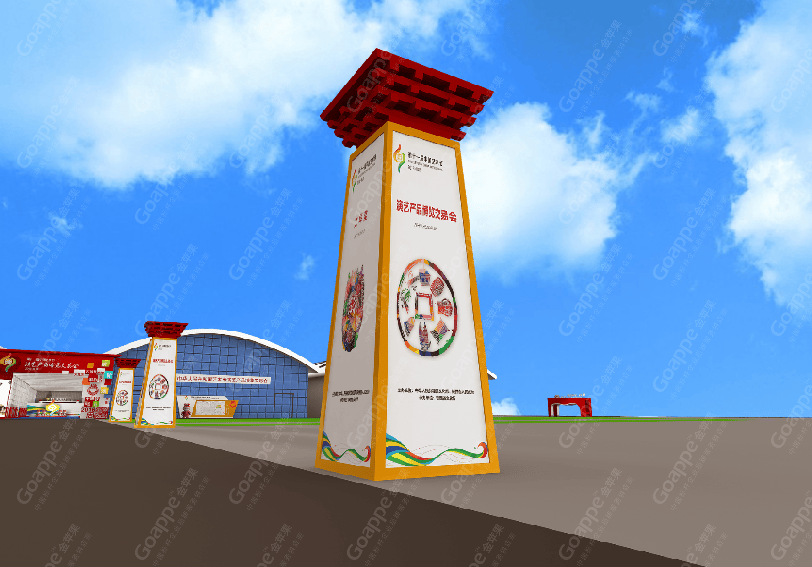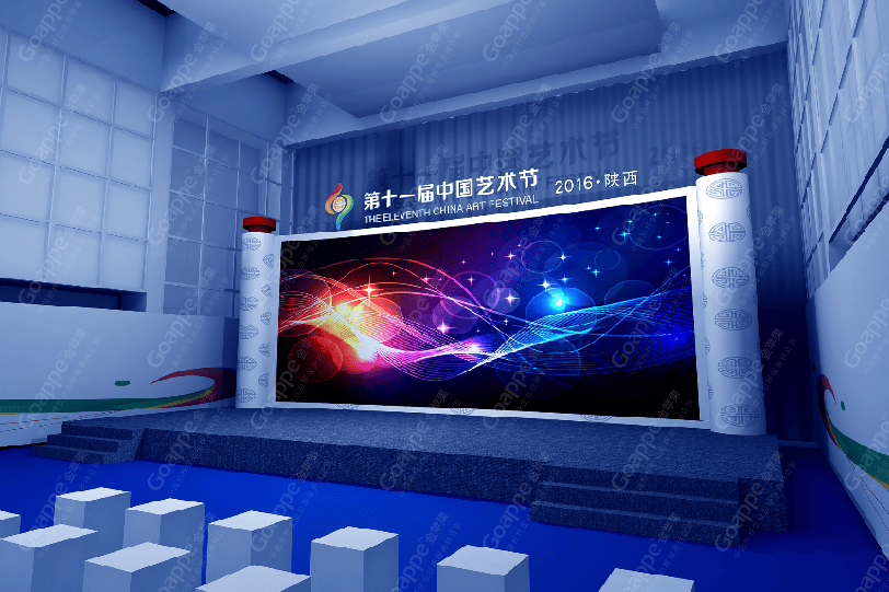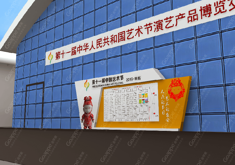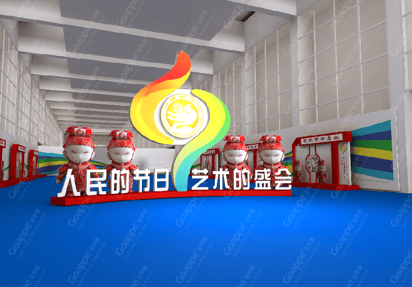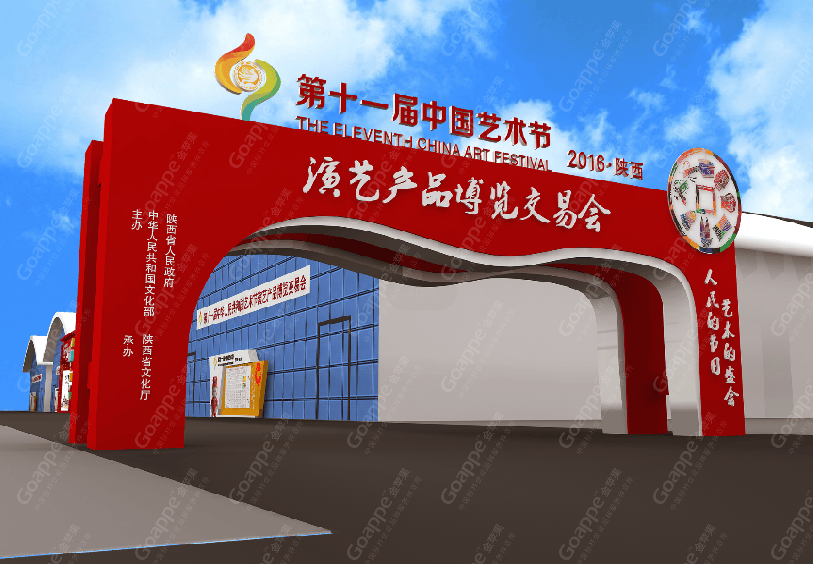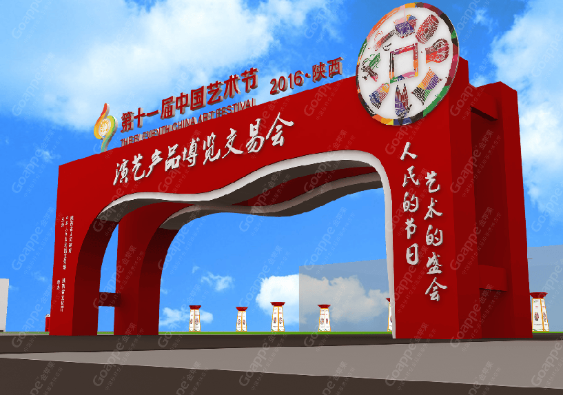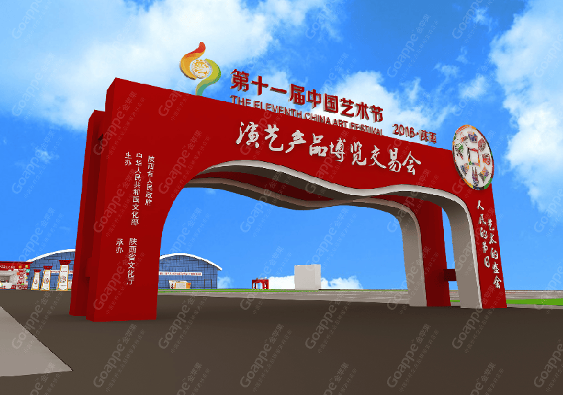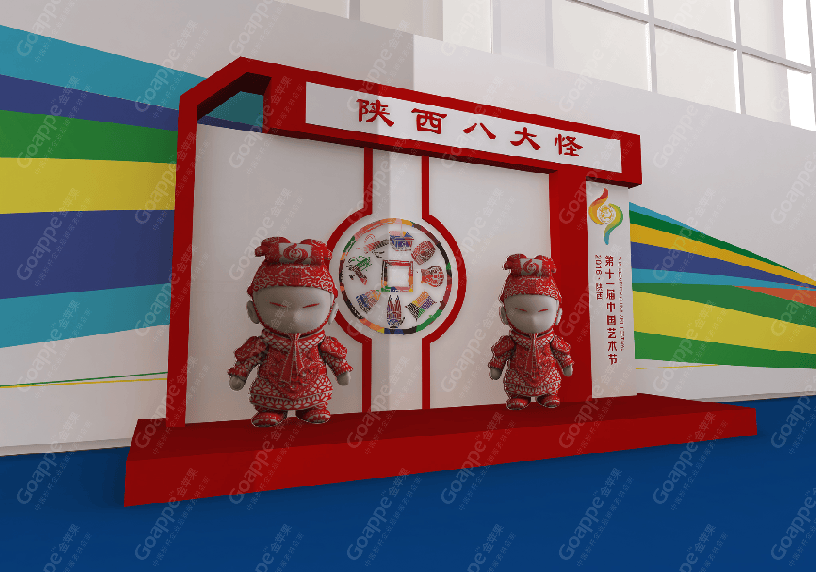 B2-B3会场的连廊拱门,一侧用图文错落的形式展现,突出陕西的地缘性,融入中国的大背景,富有艺术 感。拱门左侧用一扇古代大门样式展现,中间设置了LED大屏,动态展现十一艺节相关画面,整体动静结合,立体感十足。 陕西特色展台设计上以十一艺节标志“中和”为创意基础,融入演交会海报标识,并结合秦亲宝贝造型, 形成简约大气的展台造型。同时,区域中间搭建了十一艺节标志展台,并有四个威武的“秦亲宝贝”护航,并融入 “人民的节日,艺术的盛会”口号宣传。进入开幕式舞台会场,古典的卷轴造型大气又散发着艺术气息,使整个舞台背景更富画面感,十分贴切此次盛事的格调。