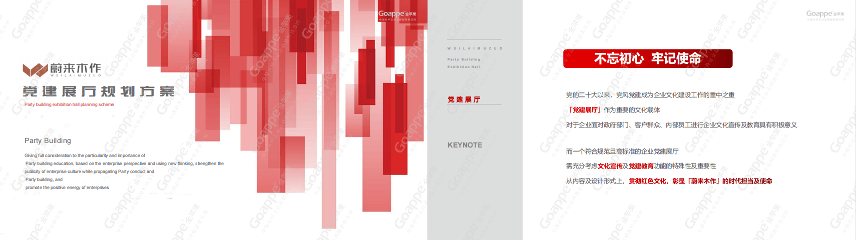 金苹果广告基于党建展厅“红色文化”建设核心,结合「蔚来木作」企业文化与搭建载体场景环境,凭借丰富的策展思维打造定制化展厅,实现内容与视觉效果的双重满足。