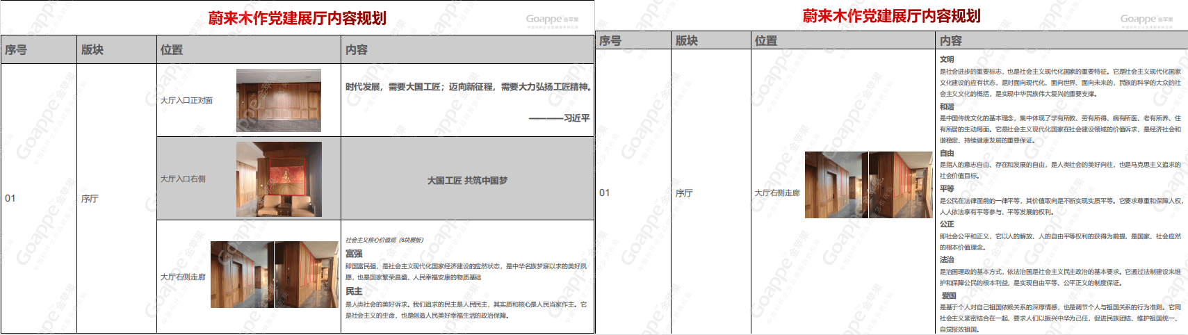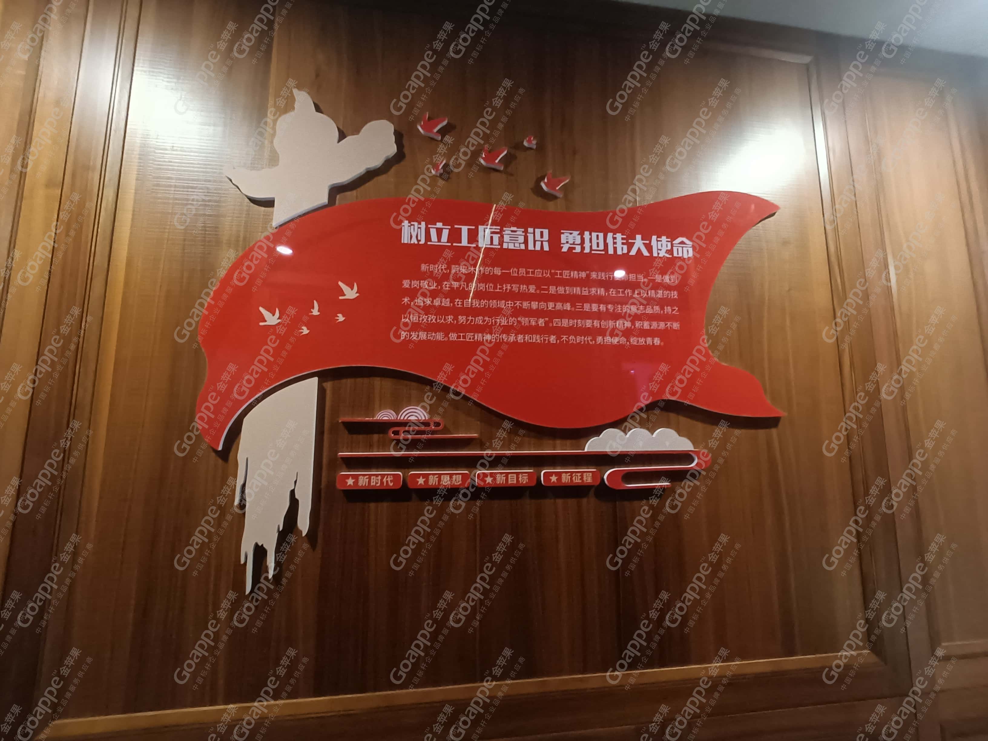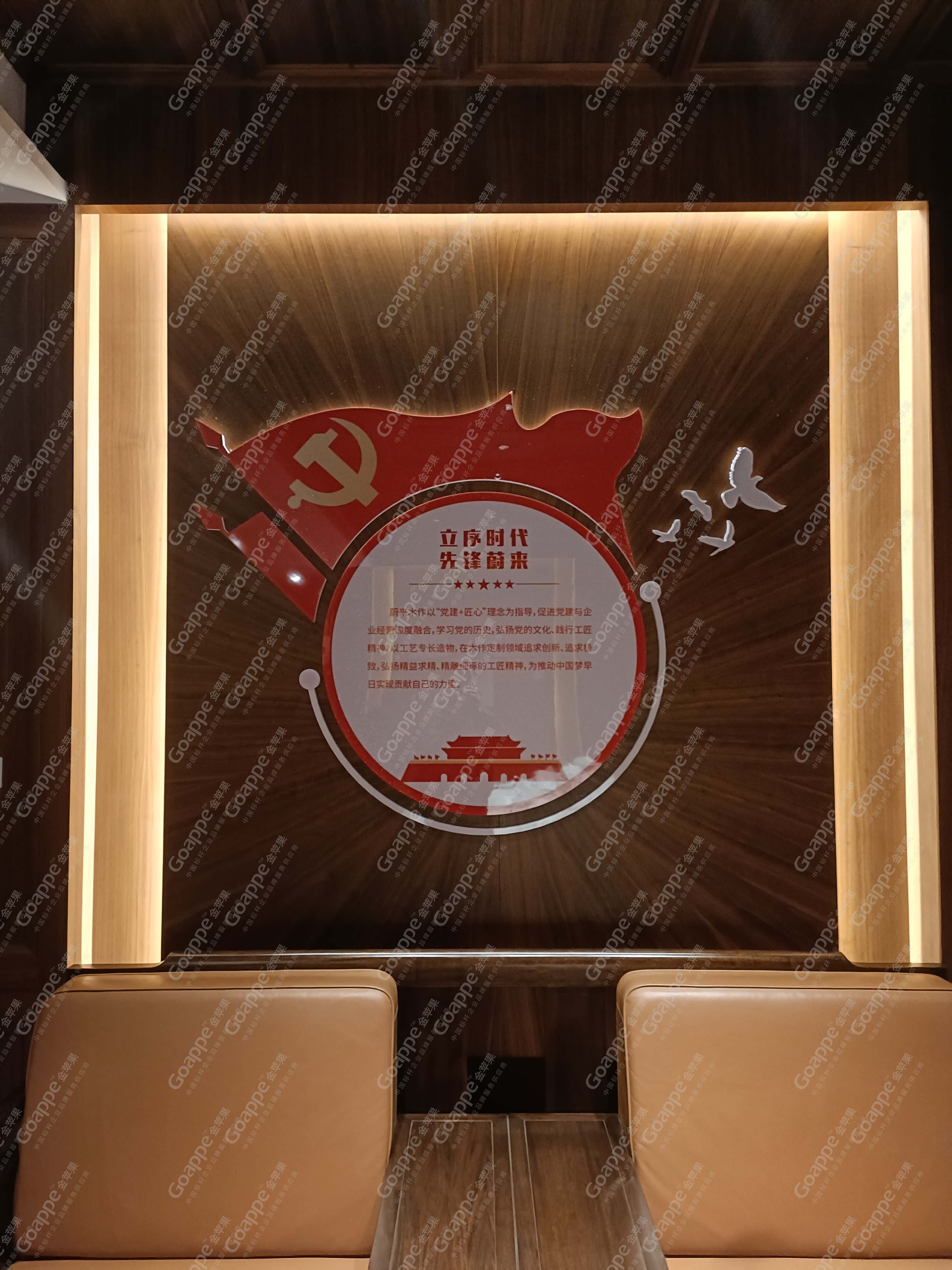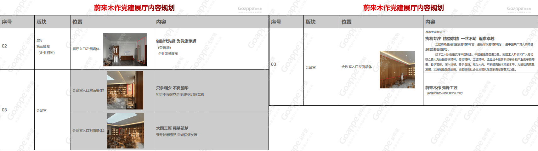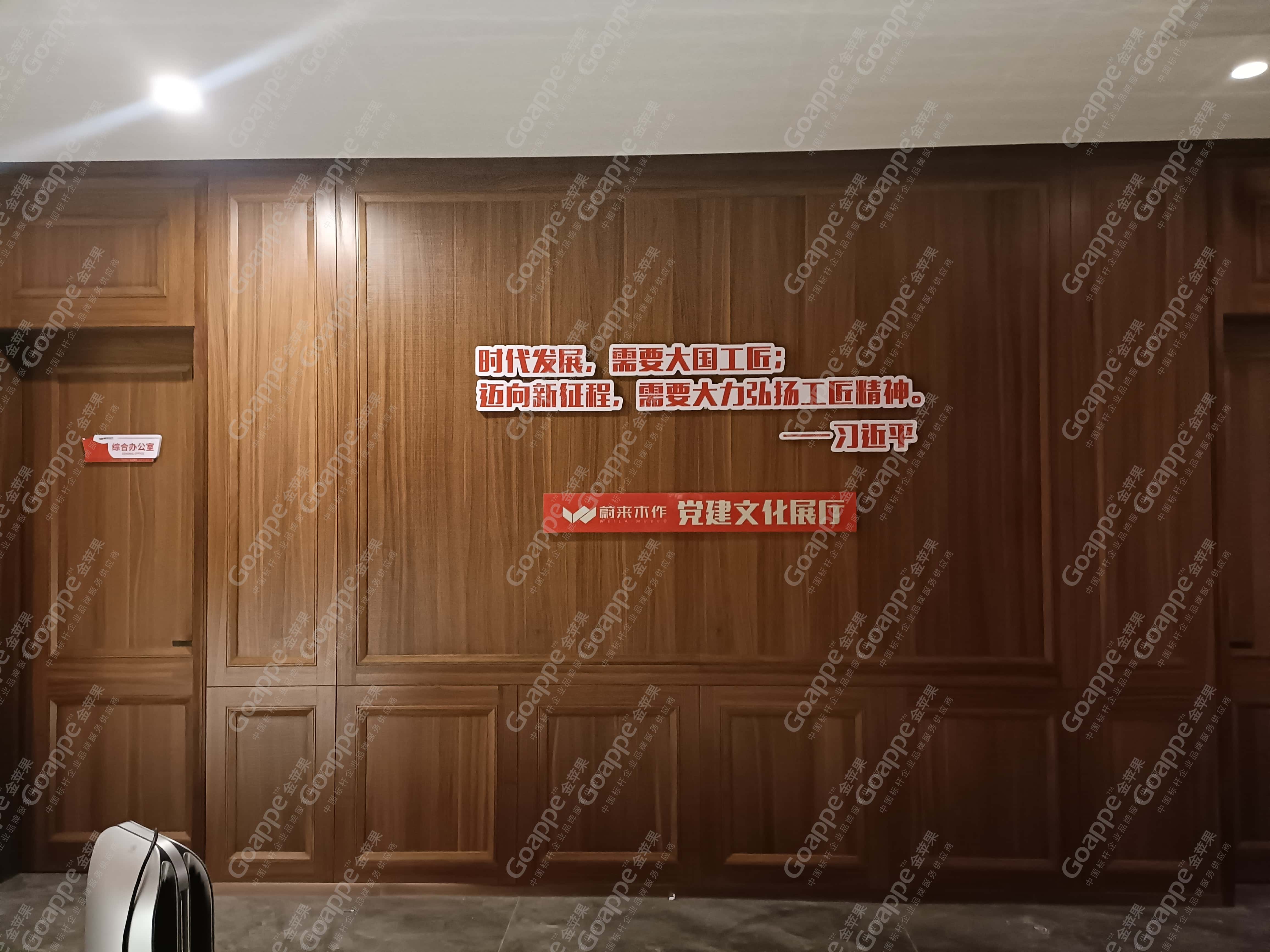 而经前期沟通与企业文化解读发现,「蔚来木作」企业所想传达的核心,即是“工匠精神”,因此在整体的内容规划上,金苹果适当融入党的文化内涵中,体现大国工匠及工匠精神的成果及内容,并结合「蔚来木作」“党建大厅”“党建活动室”、“党员学习室”及“党建会议室”四大空间的位置及面积,进行内容逻辑的合理布局,使得展厅“别出心裁”。