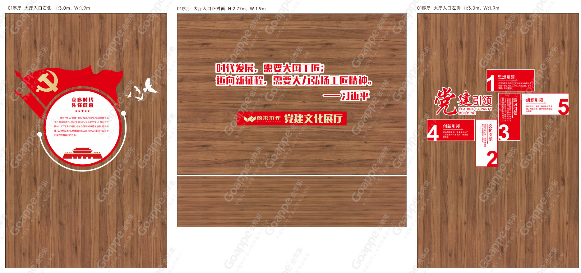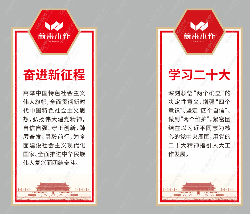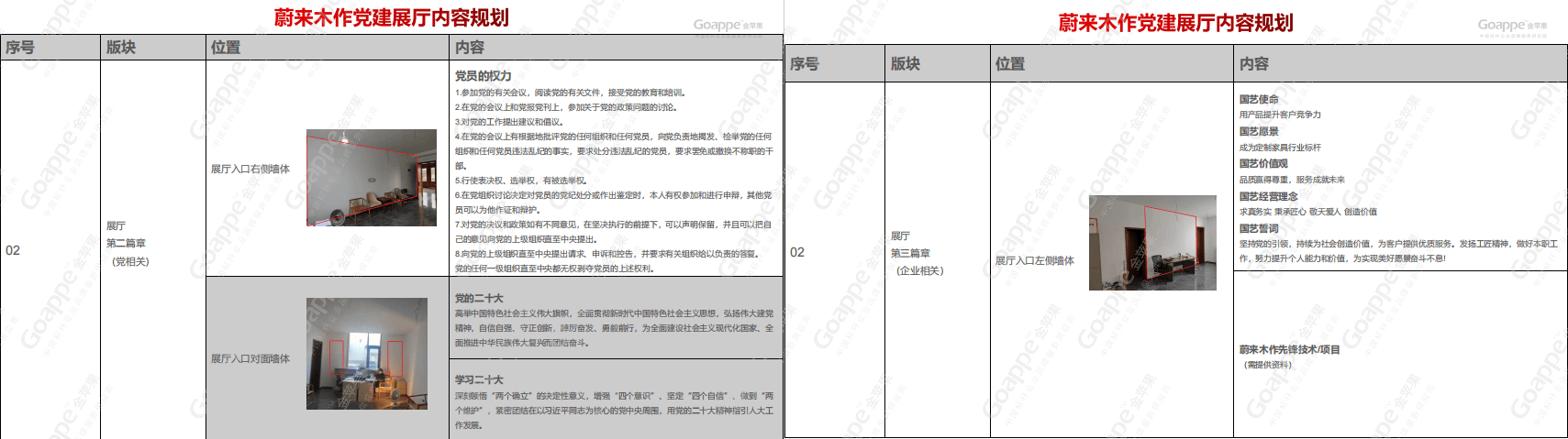 内容与逻辑,是党建展厅的文字表达形式,而画面组合设计,则是展厅最直观的视觉表达方式。在「蔚来木作」党建展厅的设计考量上,除一般党建展厅会综合运用的“党徽”、“党旗”、“红绸”等设计元素的比例尺寸等,“红色”及“金色”主色调及辅色的搭配等,还需因地制宜,对于「蔚来木作」“党建大厅”和“党建会议室”特殊的木质墙体与空间形态,需更加细致的考究设计版面的配色及造型,使其不脱离党建展厅的红色主基调,又有不脱离空间场景的美感,由此实现设计效果的最优化。