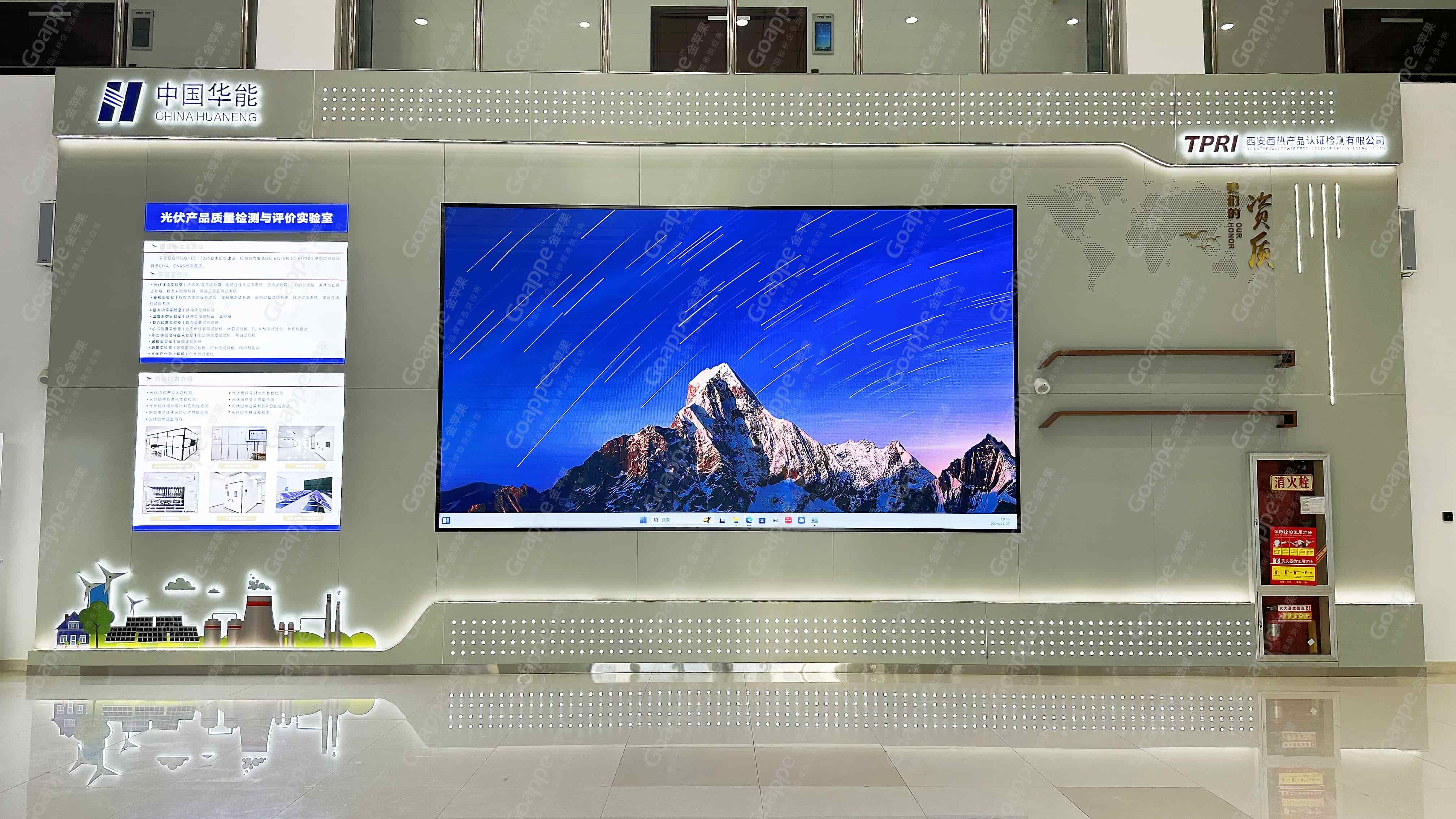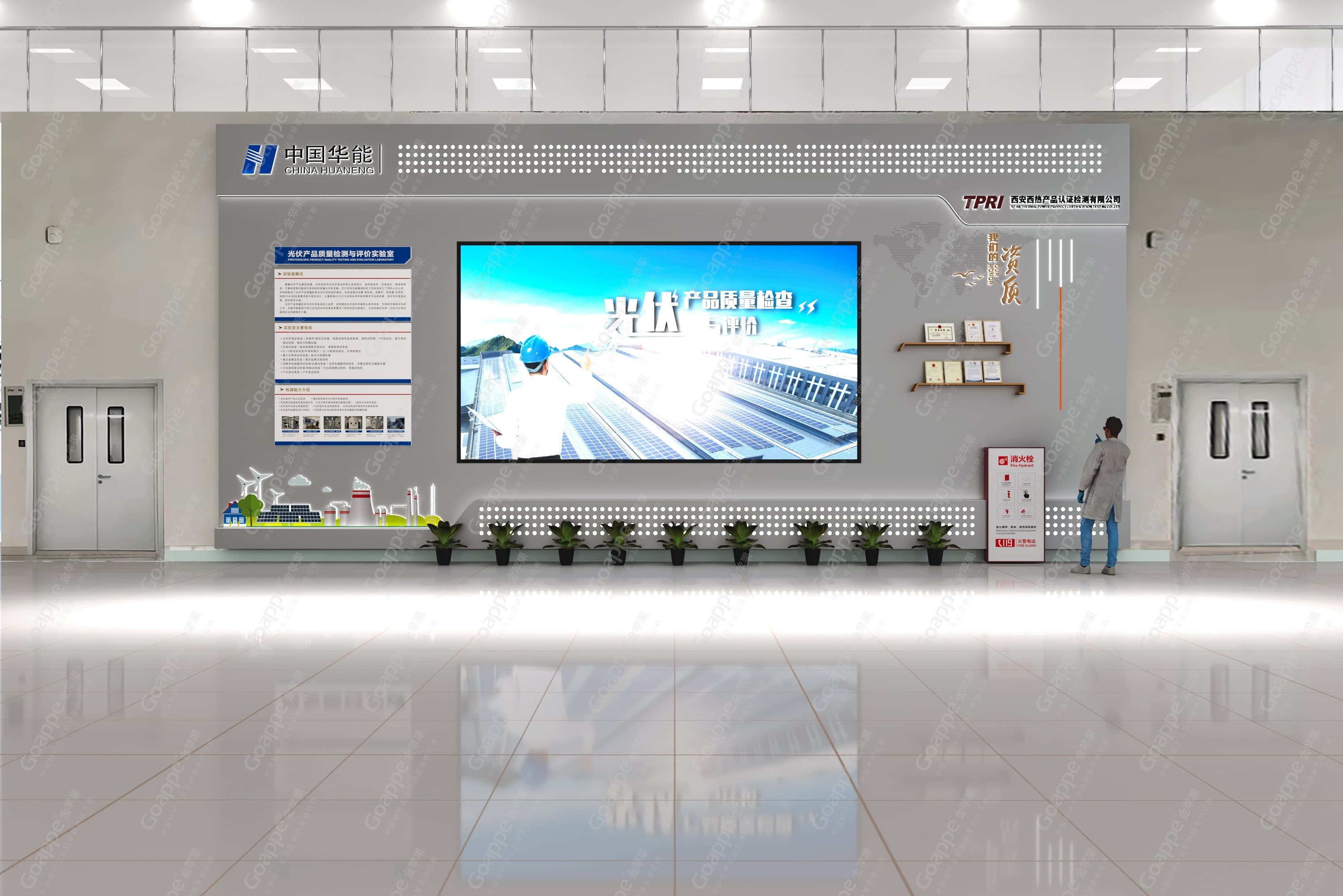 实验室作为技术研究与试验的操作空间,在外观设计上必然要遵循至简原则,设备为主装饰为次,最大化的突出空间的使用功能。因此本次光伏实验室改造,设计团队整体选用具有技术代表性的灰色为主色调,在开放区域搭建多媒体LED大屏,并充分利用墙面空间富裕优势,与LED屏作整体性展示设计,同步展出实验室信息及资质奖项,使其成为实验室重要的形象展示窗口,迎接往来受众。