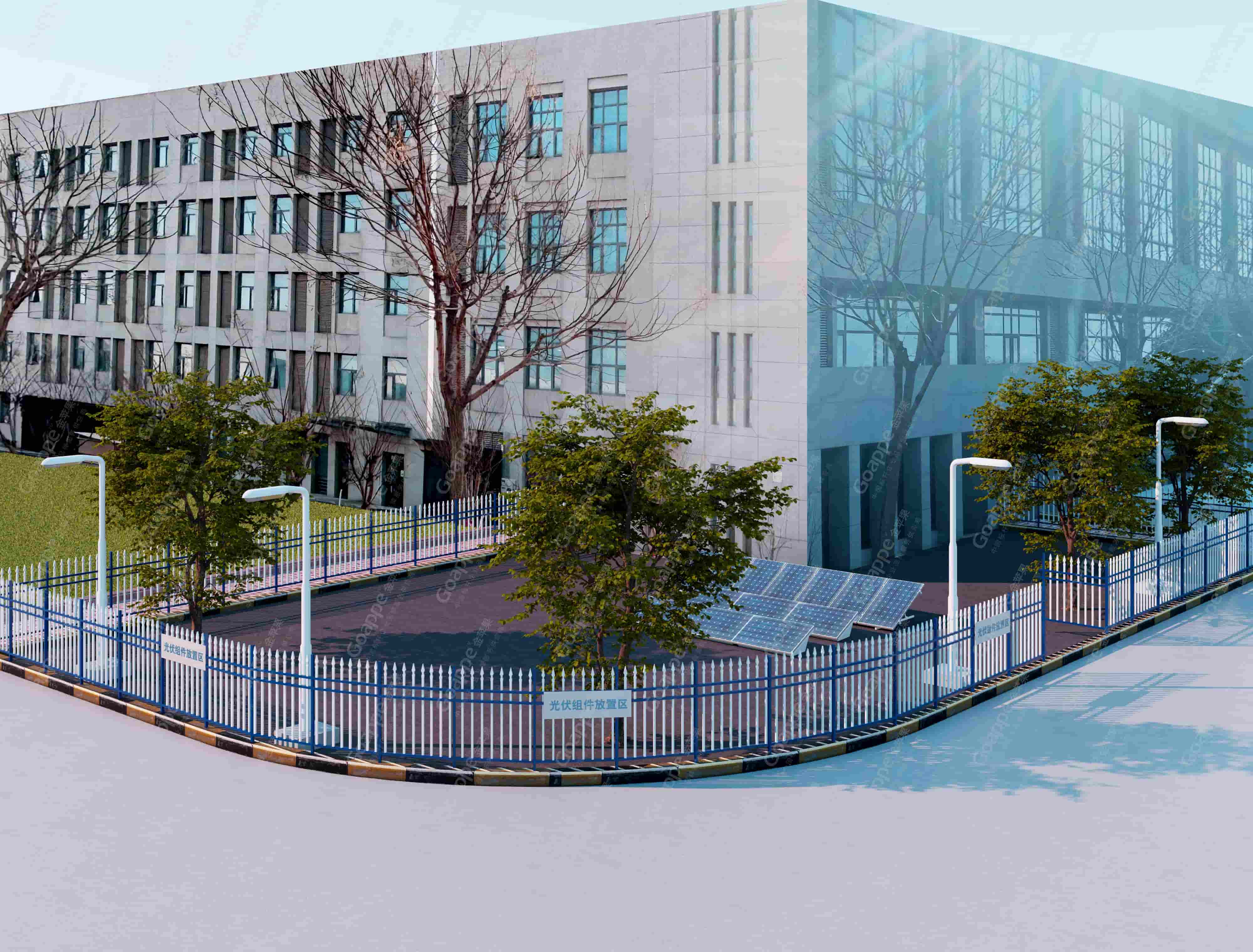当然,除了室内实验空间外,室外也同步设计了光伏组件放置区域,该区域位于实验室建筑楼体侧拐角处,可采取三角围栏式设计,地面则做硬化处理,便于组件的持久停放与归置,闭环式放置区域由此形成。