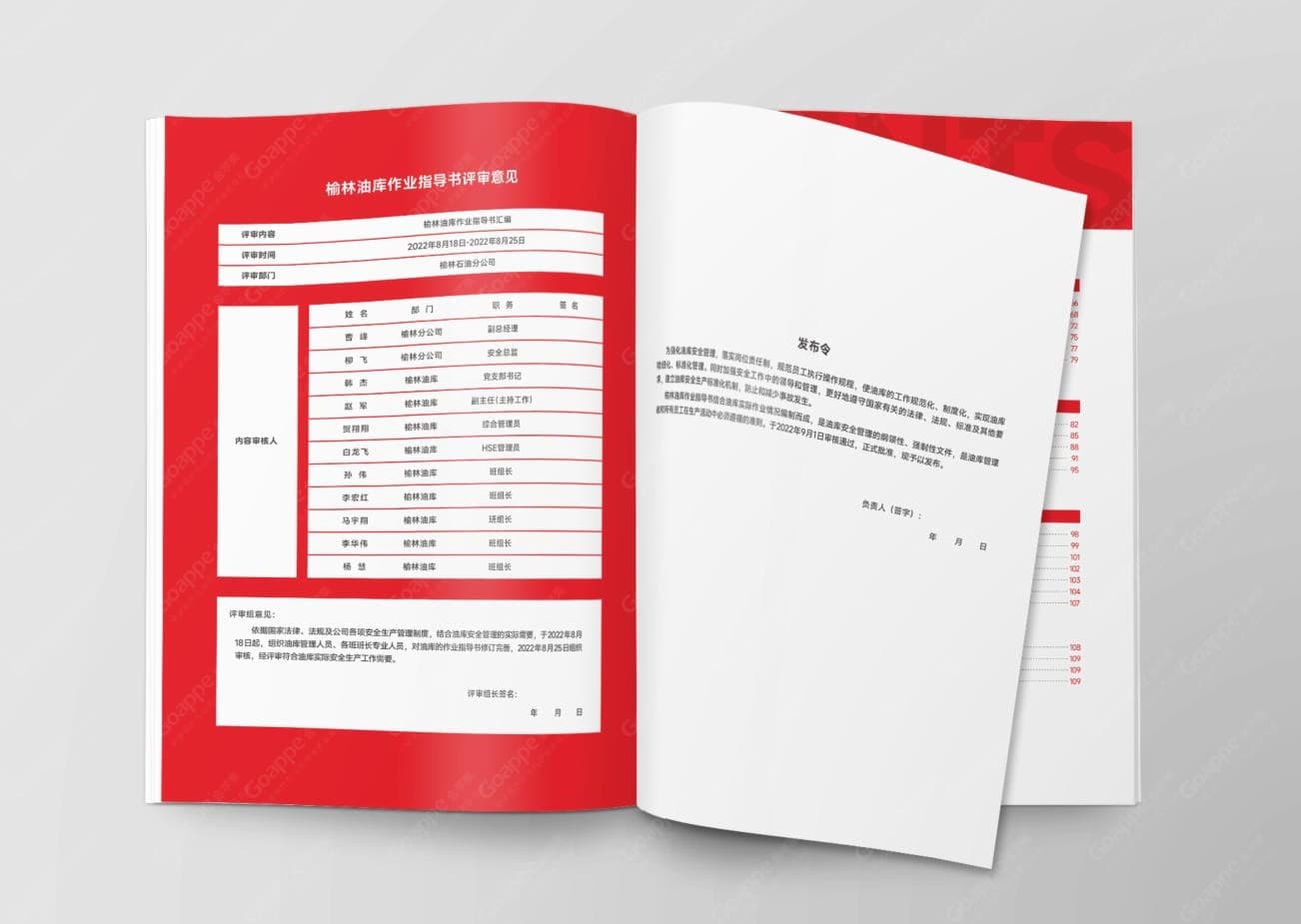 做好油库的安全生产管理,并非是一句空头口号,而是有着实质的规范制度,中国石化《油库作业指导书汇编》,即旨在将管理制度更加清晰、系统的呈现出来。从设计师所考虑的视觉角度出发,为将指导书内容清晰明确的呈现出来,整体版面选择“简而不凡”的设计手法,避免繁琐的装饰素材堆积,并在色彩组合上,大面积用色只选用中国石化的标准色“红色”及“白色”,以极简的视觉效果,进一步明确油库安全管理规章制度内容,由此发挥指导书的真正作用。