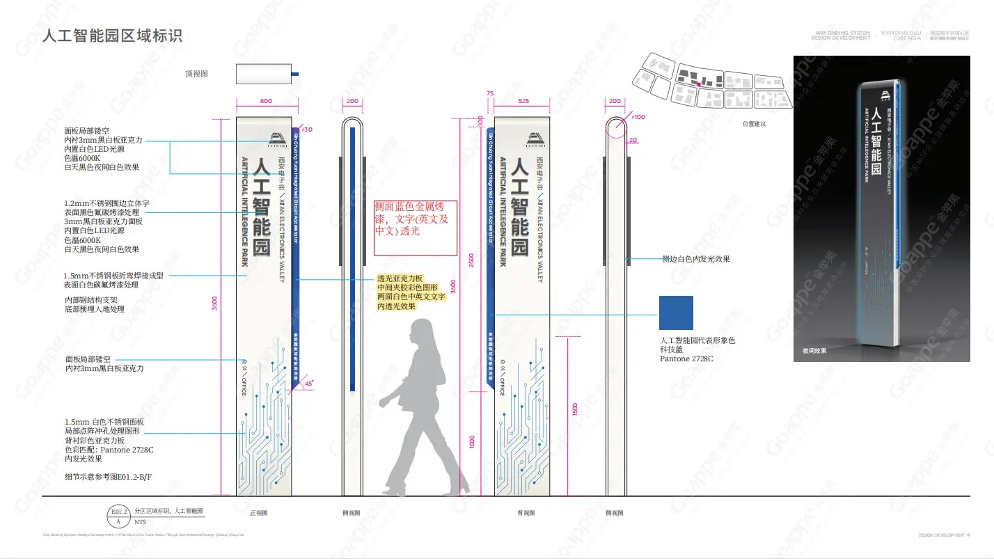 Goappe作为资深的标识导视服务企业,深知不同环境空间的导视系统除了提供方向指引、标识、地图等基本功能,还对提升空间整体形象和用户整体体验有着重要作用。因此在西安电子谷A区导视系统设计方案深化前,Goappe团队多次前往电子谷,对园区每个点位及后期导视装置安装的方位进行了实地踩点预设,以确保后期工作的高度准确性与匹配性。