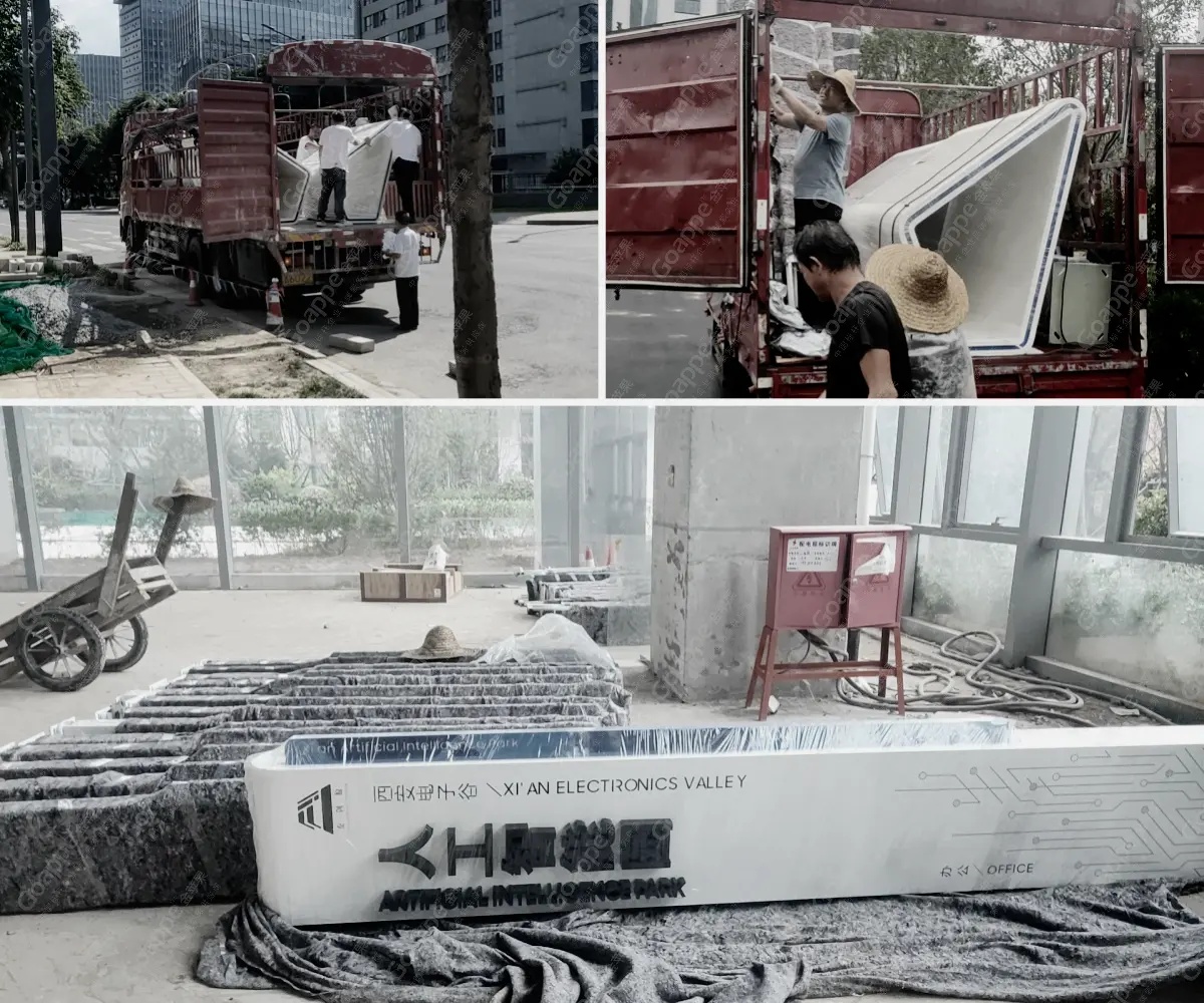 设计工作的完备,为后续制作安装等提供了重要的保障性工作。全套标识导视设计经确认无误后,则交由制作团队,根据设计风格及整体空间环境情况,选用不锈钢板等高耐用性材质,借助切割、打磨、刻字等加工工艺,按照设计图纸精细加工而成,同时为保证运送过程中导视装置的安全与质量,因此采用分批运输的方式送至电子谷相应位置,以便于现场安装。