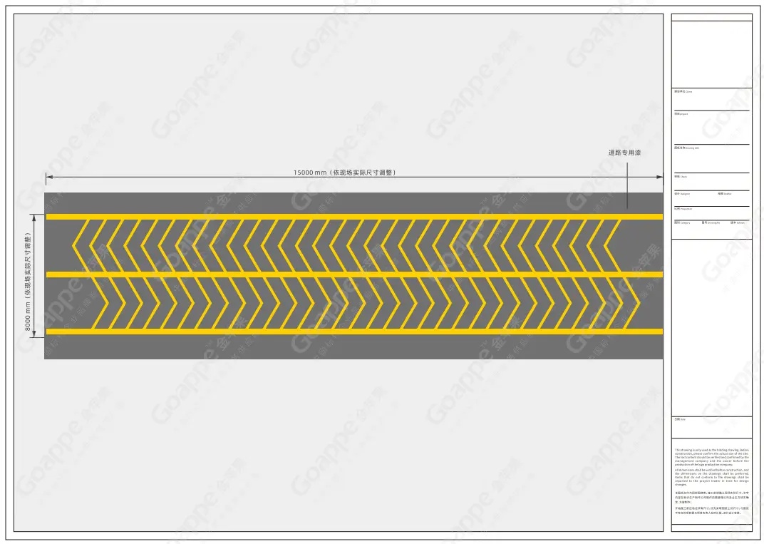 项目工程在正式大范围施工前,对划线材料的选择和小范围打样实验是必要的步骤。本项目在应用材料的选择上,团队综合考量“耐久性”、“美观性”、“环保性”、“经济性”四大原则,实地走访多个供应商原厂进行参数及效果对比,最终选择得以确认用料。