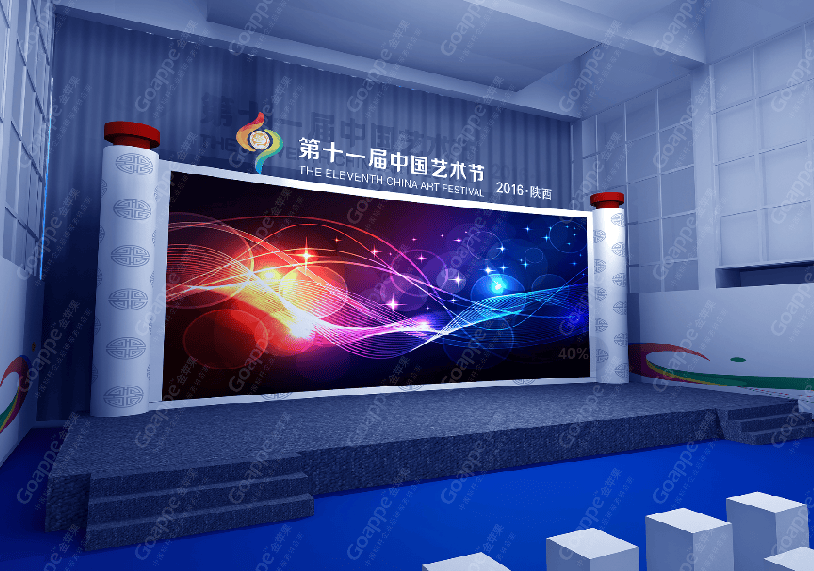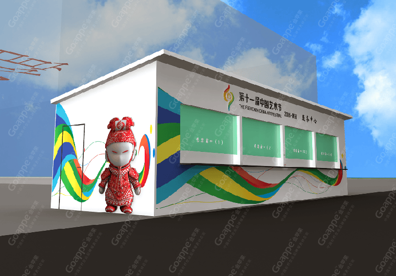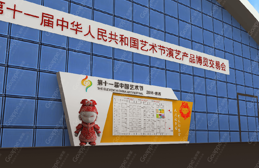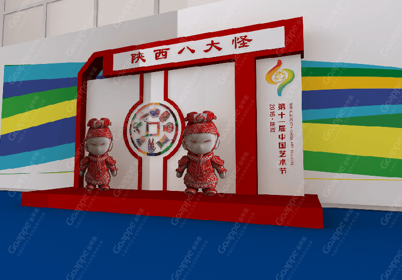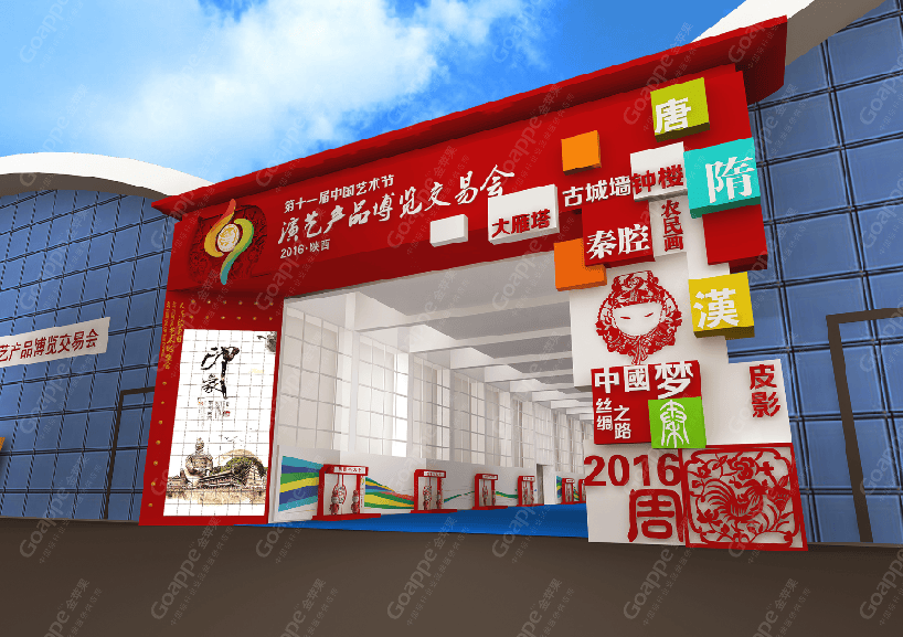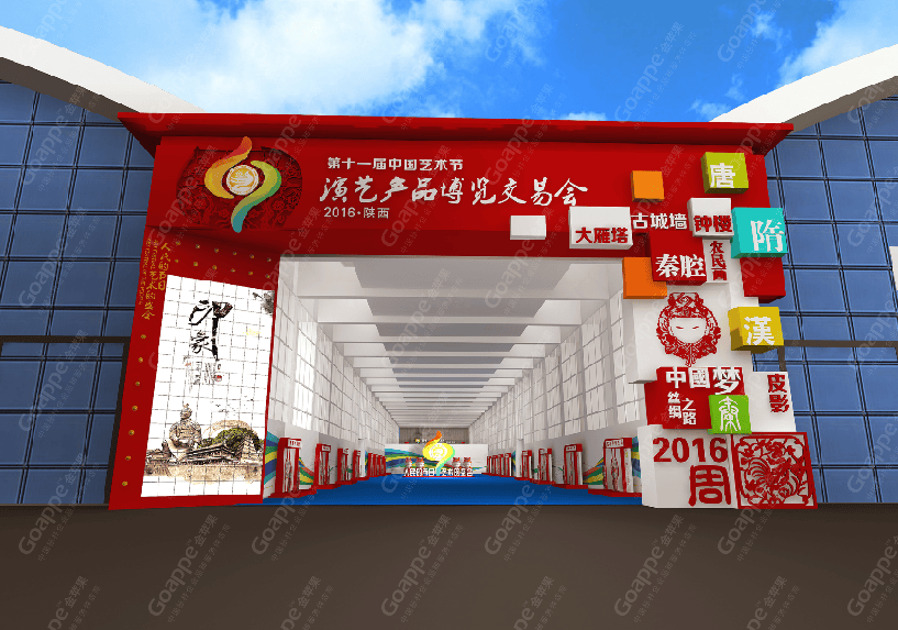 B2-B3会场的连廊拱门,一侧用图文错落的形式展现,突出陕西的地缘性,融入中国的大背景,富有艺术 感。拱门左侧用一扇古代大门样式展现,中间设置了LED大屏,动态展现十一艺节相关画面,整体动静结合,立体感十足。 陕西特色展台设计上以十一艺节标志“中和”为创意基础,融入演交会海报标识,并结合秦亲宝贝造型, 形成简约大气的展台造型。同时,区域中间搭建了十一艺节标志展台,并有四个威武的“秦亲宝贝”护航,并融入 “人民的节日,艺术的盛会”口号宣传。进入开幕式舞台会场,古典的卷轴造型大气又散发着艺术气息,使整个舞台背景更富画面感,十分贴切此次盛事的格调。