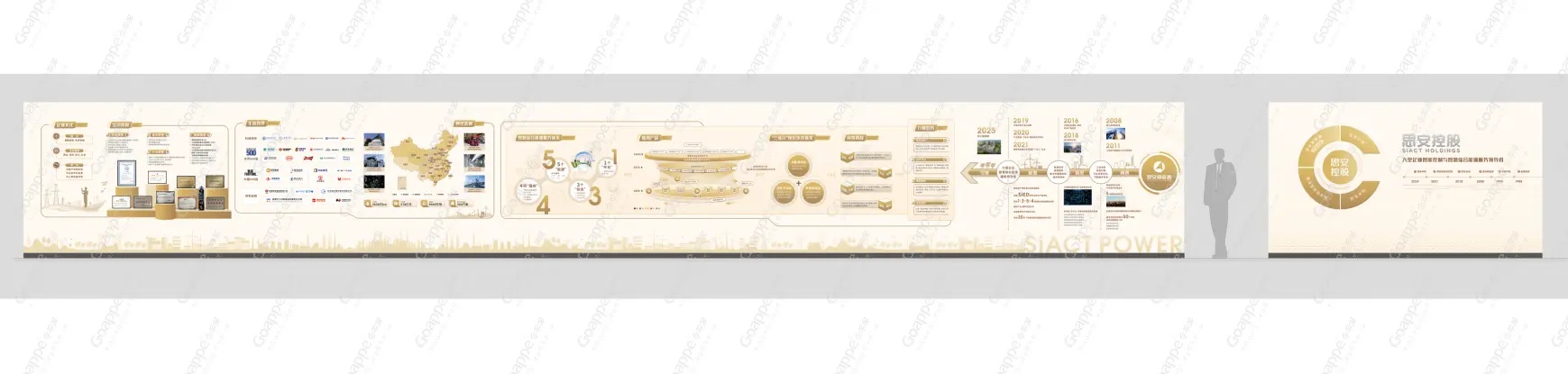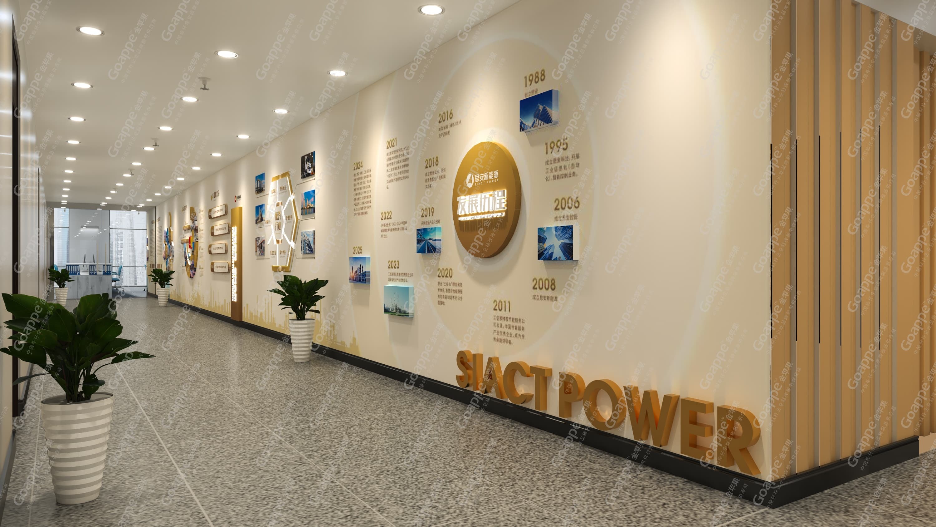 何为定制设计?尺寸、内容、风格等全方位匹配化设计,高度的契合空间环境与企业文化,即为定制。经过多轮内容及设计细节的商榷后,项目团队与客户方终达成一致,确定了以企业VI色“金色”为文化墙主色调,通过简约、连贯的视觉表现方式,清晰的传递企业组织架构、文化建树、成长脉络及发展成果等内容,充分展示企业发展实力,同时为现有环境空间增色!