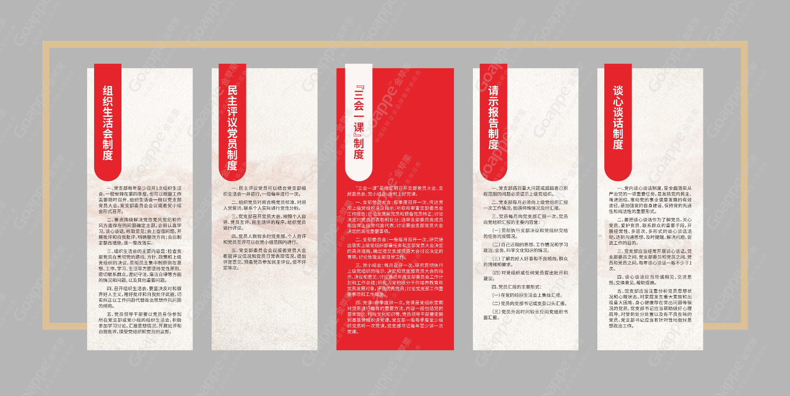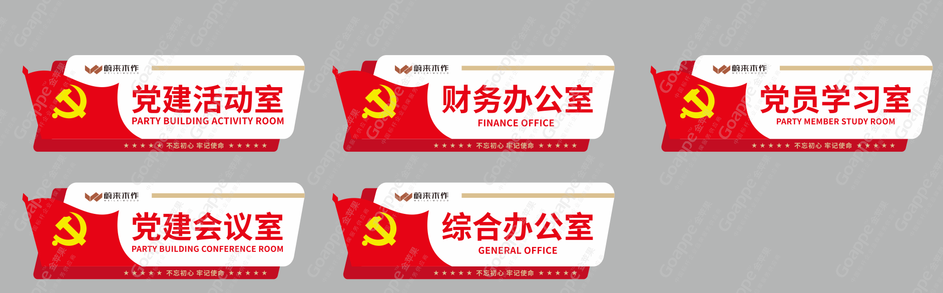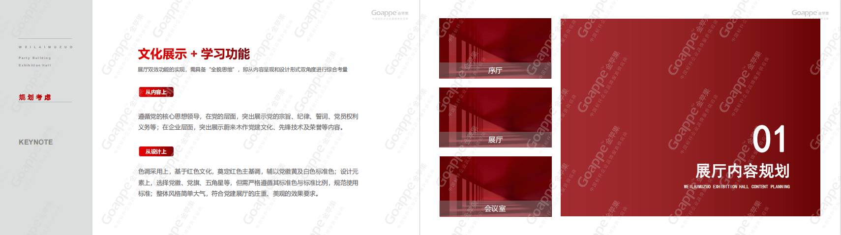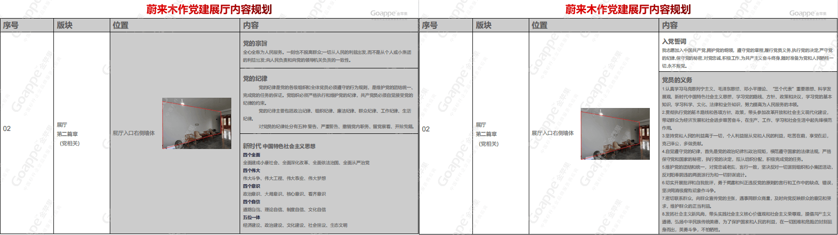 内容与逻辑,是党建展厅的文字表达形式,而画面组合设计,则是展厅最直观的视觉表达方式。在「蔚来木作」党建展厅的设计考量上,除一般党建展厅会综合运用的“党徽”、“党旗”、“红绸”等设计元素的比例尺寸等,“红色”及“金色”主色调及辅色的搭配等,还需因地制宜,对于「蔚来木作」“党建大厅”和“党建会议室”特殊的木质墙体与空间形态,需更加细致的考究设计版面的配色及造型,使其不脱离党建展厅的红色主基调,又有不脱离空间场景的美感,由此实现设计效果的最优化。