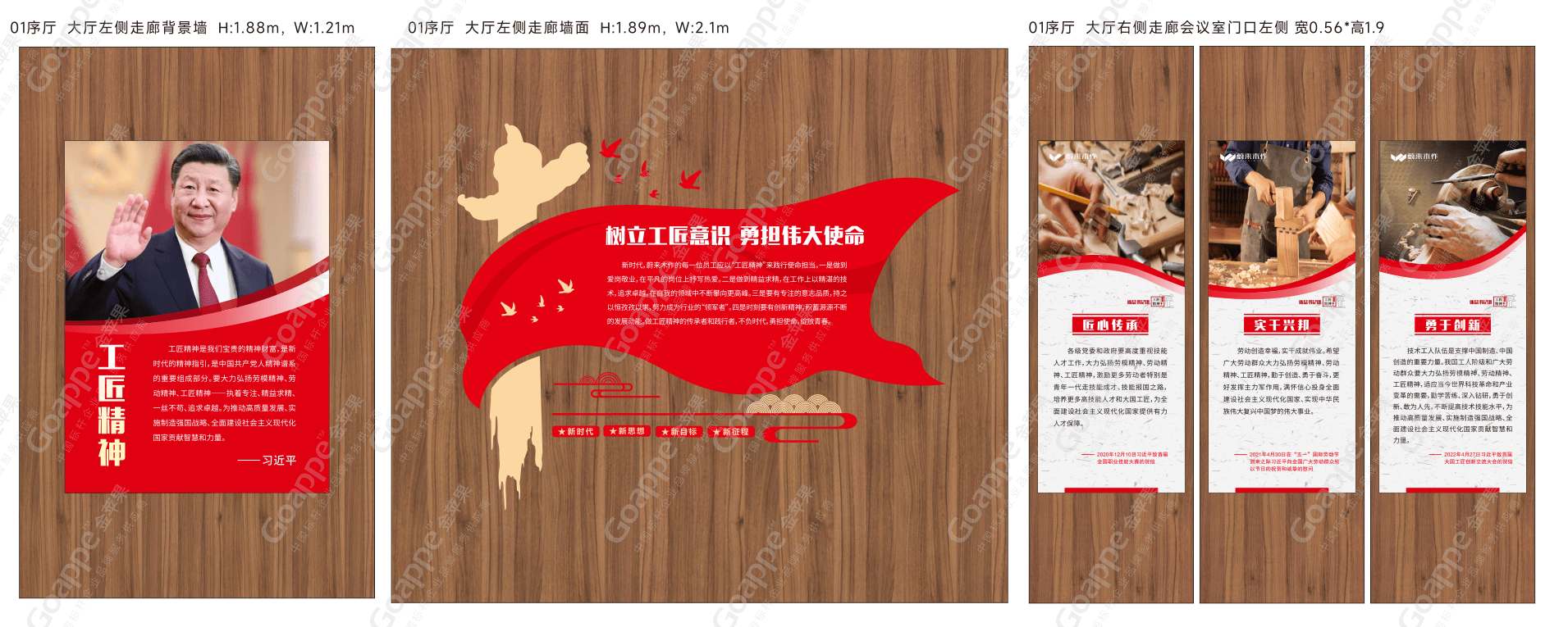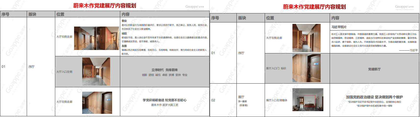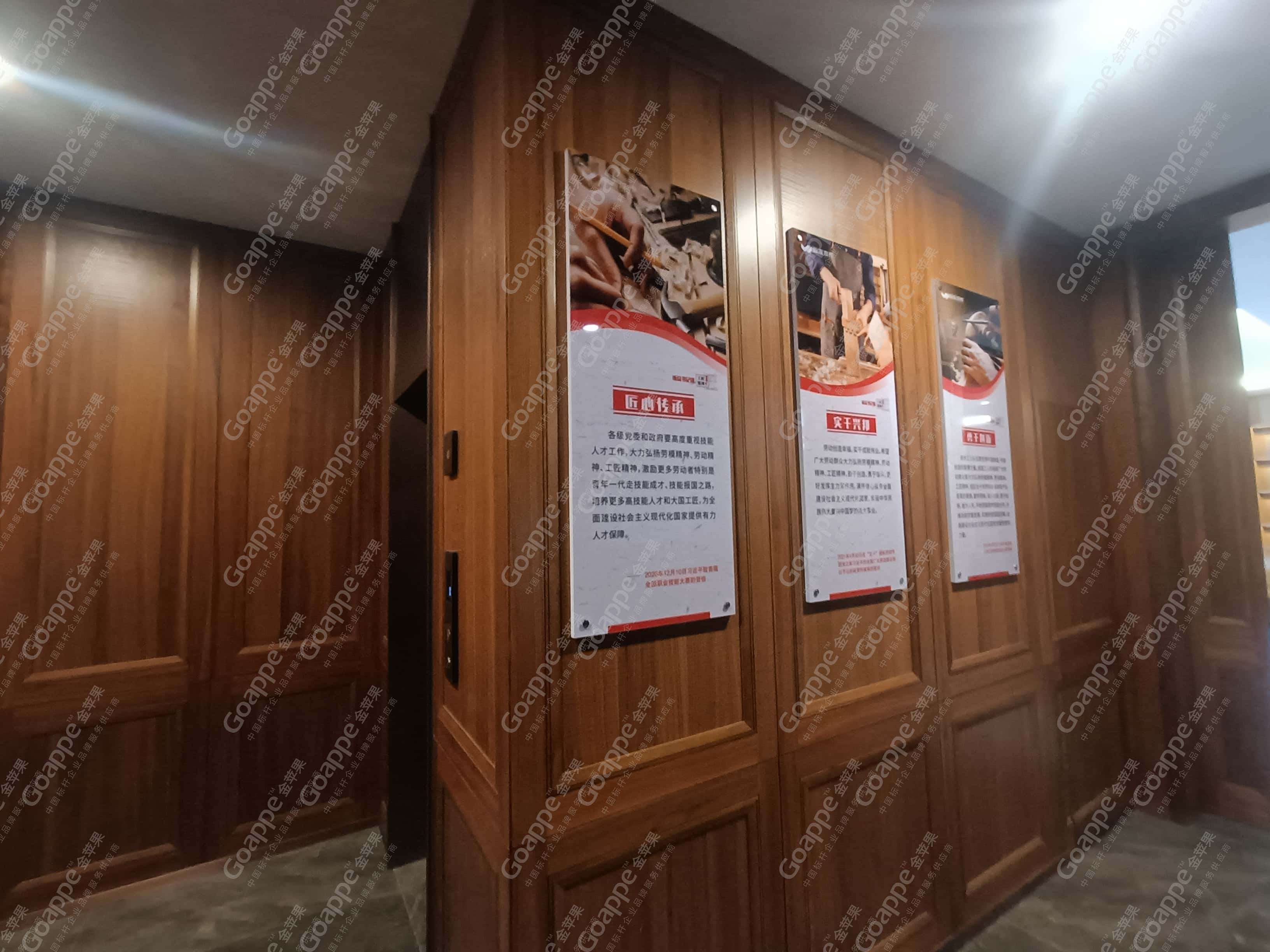 而经前期沟通与企业文化解读发现,「蔚来木作」企业所想传达的核心,即是“工匠精神”,因此在整体的内容规划上,金苹果适当融入党的文化内涵中,体现大国工匠及工匠精神的成果及内容,并结合「蔚来木作」“党建大厅”“党建活动室”、“党员学习室”及“党建会议室”四大空间的位置及面积,进行内容逻辑的合理布局,使得展厅“别出心裁”。